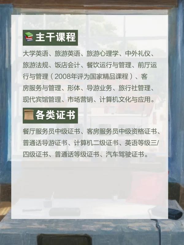 大学英语旅游英语旅游心理学中外礼仪旅游法规饭店会计餐饮运行与管理前厅运行与管理(2008年评为国家精品课程)客房服务与管理形体导游业务旅行社管理现代宾馆管理市场营销计算机文化与应用